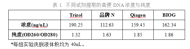 鉴于粪便样本的独特性质,本研究选取了当前应用最为广泛的Trizol法与三种柱提法试剂盒(包括国内知名公司N的粪便DNA提取试剂盒、Qiagen QIAamp DNA Mini Kit及BIOG粪便DNA提取试剂盒)进行对比分析,旨在筛选出最优的粪便DNA提取方案。