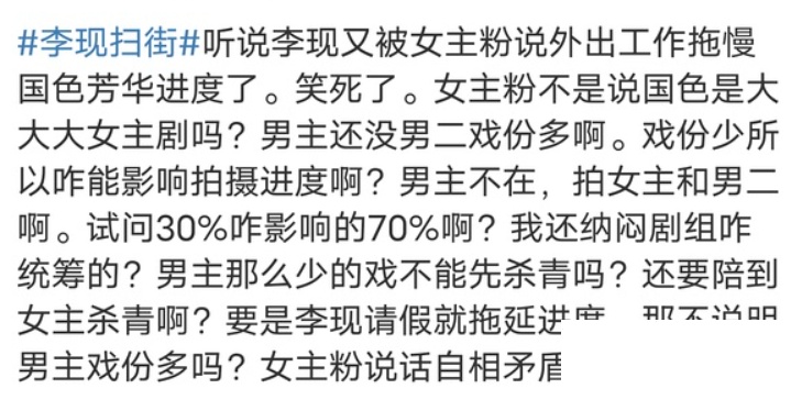 事情发展到后来,李现还拿出了证据,证明自己在剧组期间很尽责,这才让事情明朗起来。目前,这个话题已经被清理,热搜词条上也没有负面内容了,但在论坛上,还是有部分粉丝在争执。