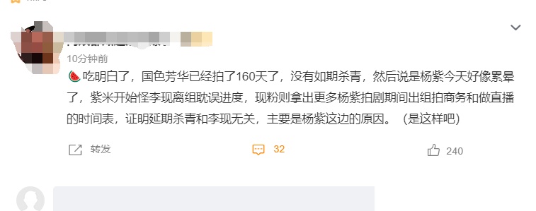 杨紫粉丝在社交平台上表示,杨紫和李现主演的剧集《国色芳华》因为李现的原因,没有按时杀青,导致杨紫的行程受到影响。粉丝们表示杨紫的戏份早已杀青,但杨紫一直等在剧组,没有离开,拍摄进度却一直没有进行下去,原因就是李现还有戏份没有完成。