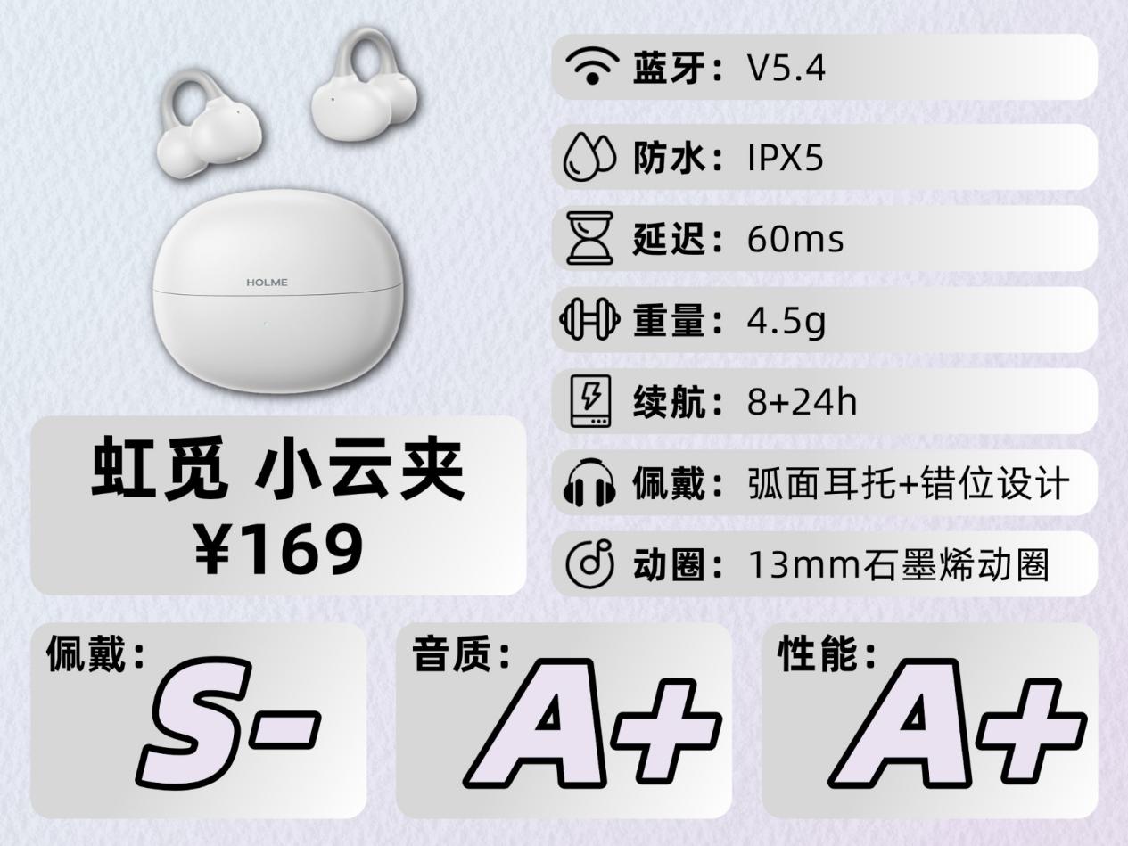 动圈上搭载了石墨烯科技振膜单元,凭借石墨烯更强的形变能力,能精准诠释声音里的诸多细节,带来更真实的听感。此外,耳机支持H-zone全景空间音效,可拓展声场、增强声音氛围感,结合虹觅声学实验室更偏向于“高保真”的调音风格,让整体的声音细腻、饱满。这款耳机的音质可以说是百元耳夹式里的最好的。佩戴方面采用了前高后低的2.5mm 错位设计,能恰好贴合耳朵形状,让佩戴更稳固;电池部分则做成∠12弧面耳托,可完美贴合耳背,进一步提升贴合度与舒适度。佩戴起来不夹耳,几乎无感。而且在性能上开发了防漏音模式,进一步改善了开放式耳机漏音问题。