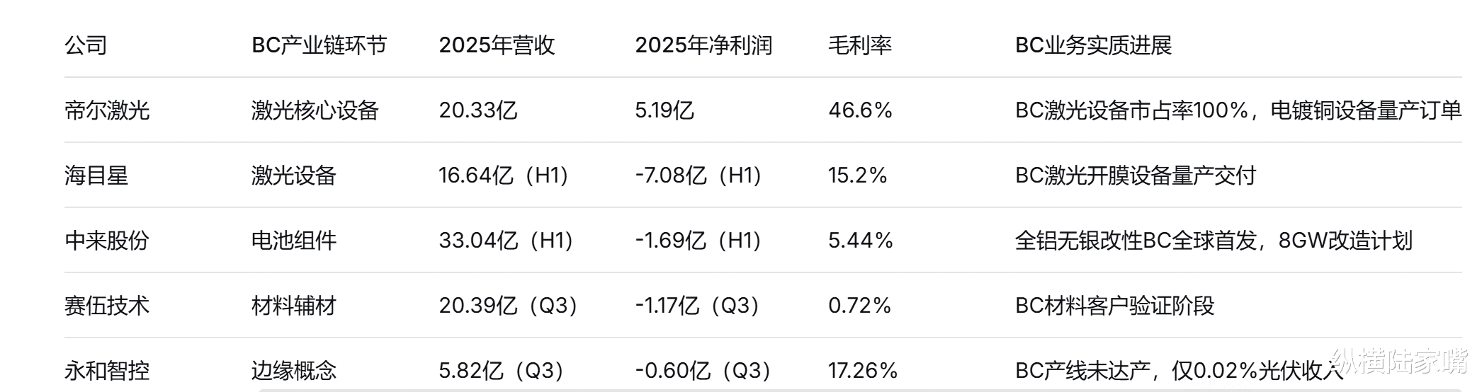 海目星同样布局BC激光开膜设备,已实现量产交付。但公司2025年上半年巨亏7.08亿元,毛利率仅15.2%,光伏设备业务大幅拖累业绩。2026年开年虽斩获20亿元锂电设备订单,但BC业务收入占比仍较低,能否扭亏尚待观察。