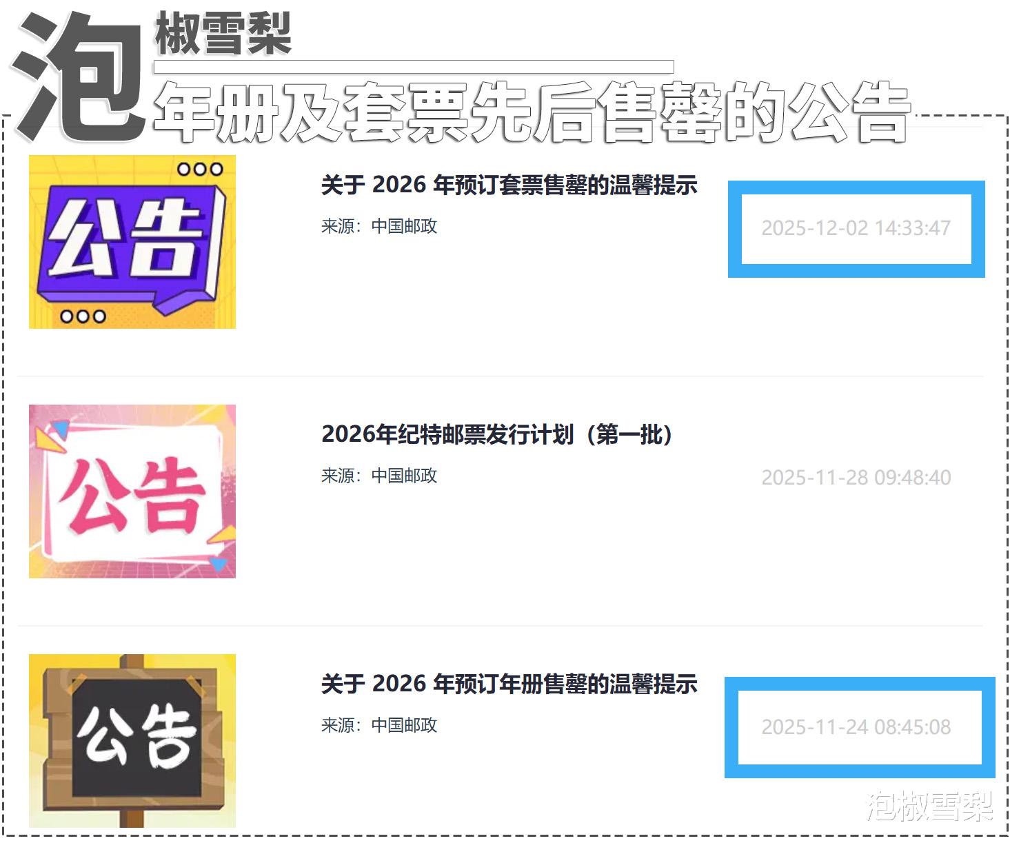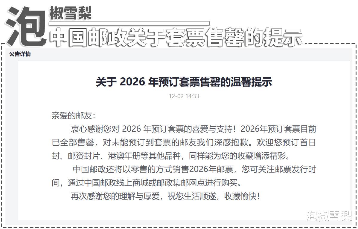 继2025年11月24日年册售罄后,12月2日14时33分,邮政宣布套票也售罄了,前后相差一周时间。很多粉丝私信让我聊聊
