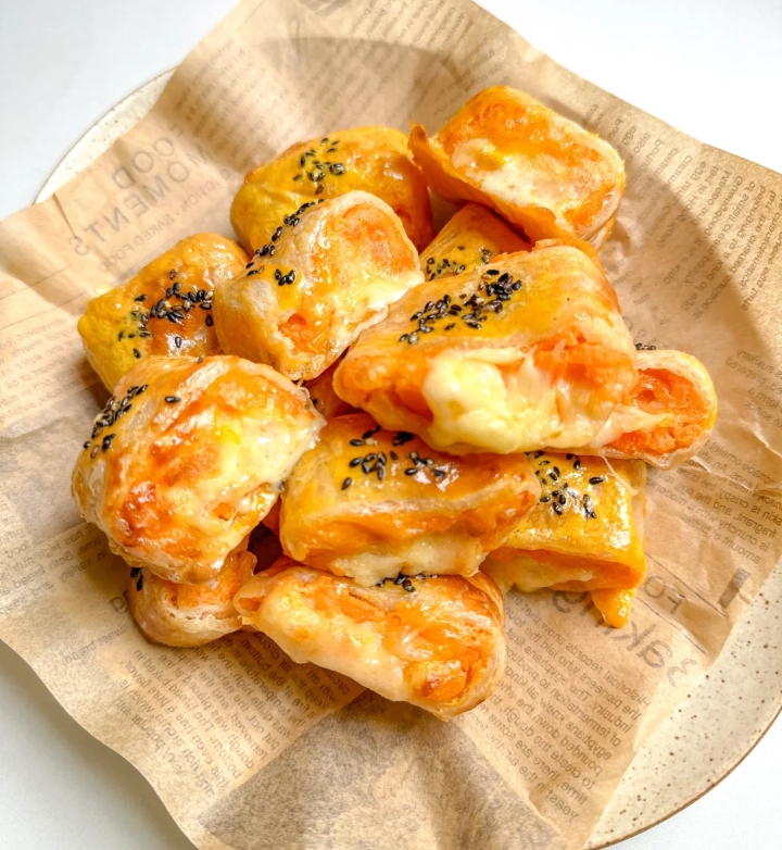 手抓饼裹着红薯泥和芝士碎,煎到外皮酥脆,咬开瞬间芝士拉丝裹着甜糯薯泥,咸香与甜香碰撞,大人小孩抢着吃,5 分钟就能搞定!