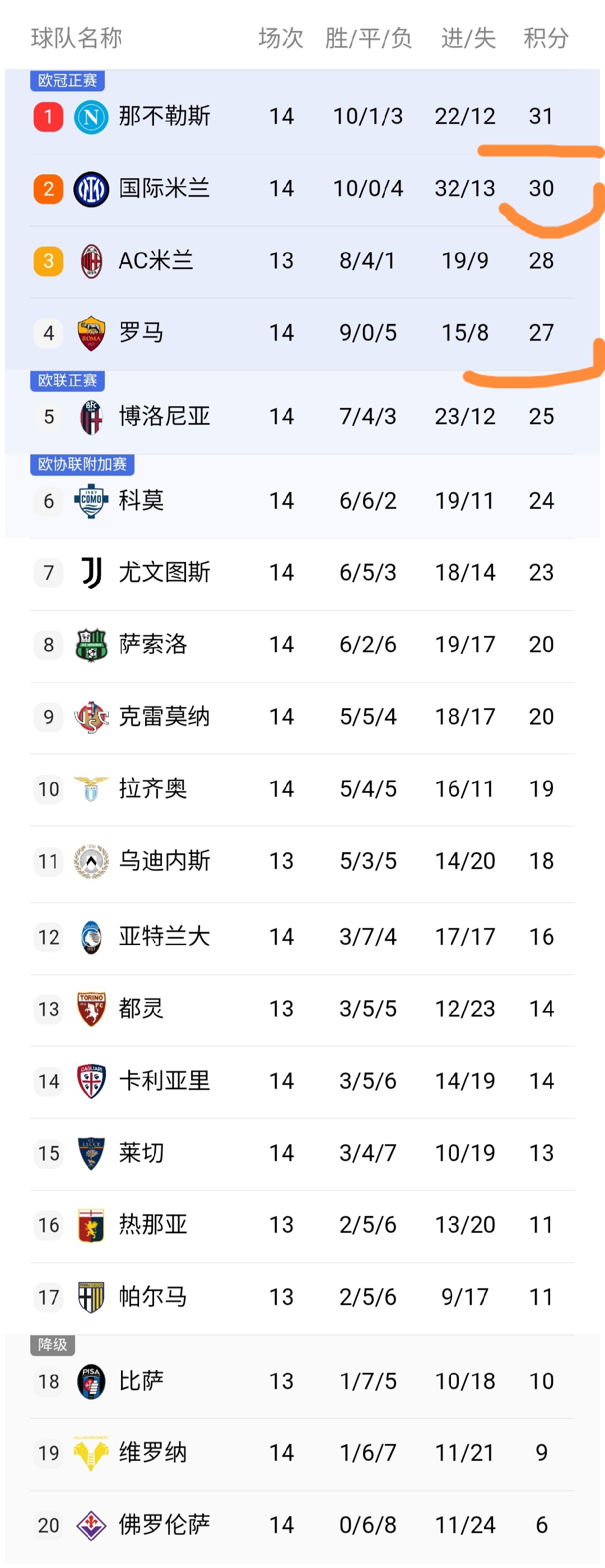 这几场比赛结束之后,意甲的最新积分榜出炉:可以看到原本坐上榜首的国际米兰屁股还没有坐热就被反超了,那不勒斯队积31分升至了第一,国米落后1分。而AC米兰少赛一场跌至第3,不过AC米兰本轮如果能够做客击败都灵队,那么AC米兰队依然会回到榜首的位置。而罗马输球之后,排在了第4的位置,罗马落后榜首的那不勒斯队4分。可以看到前四之间的差距不算太大,除了AC米兰仅输了1场之外,前四的球队都已经输了至少3场比赛,而AC米兰虽然输球少,但是平局较多,可见本赛季的意甲并没有一支球队非常强势,争冠集团的球队时不时都会犯错。这样的意甲显然是群雄争霸的,显然更有看头。