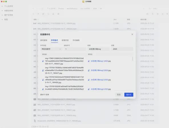 备份好之后我可以通过绿联云文件管理器自带的批量重命名功能,快速批量地整理归类素材名字,方便后期同事调用剪辑和后期。这搁以前都得靠第三方批量重命名工具,而且体验也比较一般。