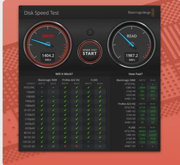 按以上步骤设置好后,这样就可以通过雷电直连方式实现高速文件传输和存取了,用blackmagic disk speed test可以看到,写入速度可以稳定在1500MB/s左右、读取速度更是可以跑到2000MB/s左右,比万兆网口还要快出很多!