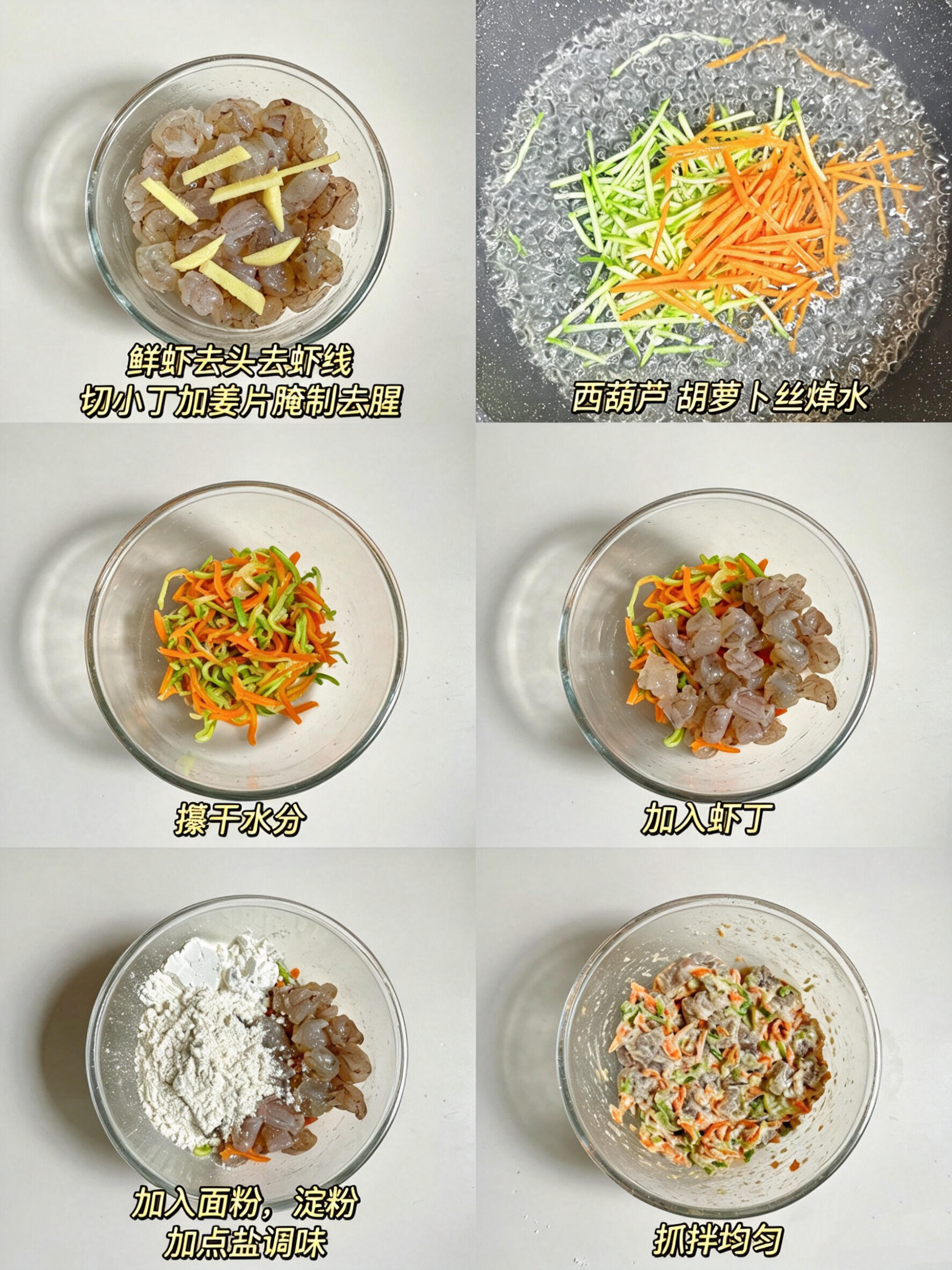 把挤干水分的西葫芦丝、胡萝卜丝、虾丁放进大碗,加面粉、淀粉、少许盐,慢慢加清水(边加边搅拌),调成能挂住筷子的稀糊(太稠饼会硬,太稀煎的时候会散)。