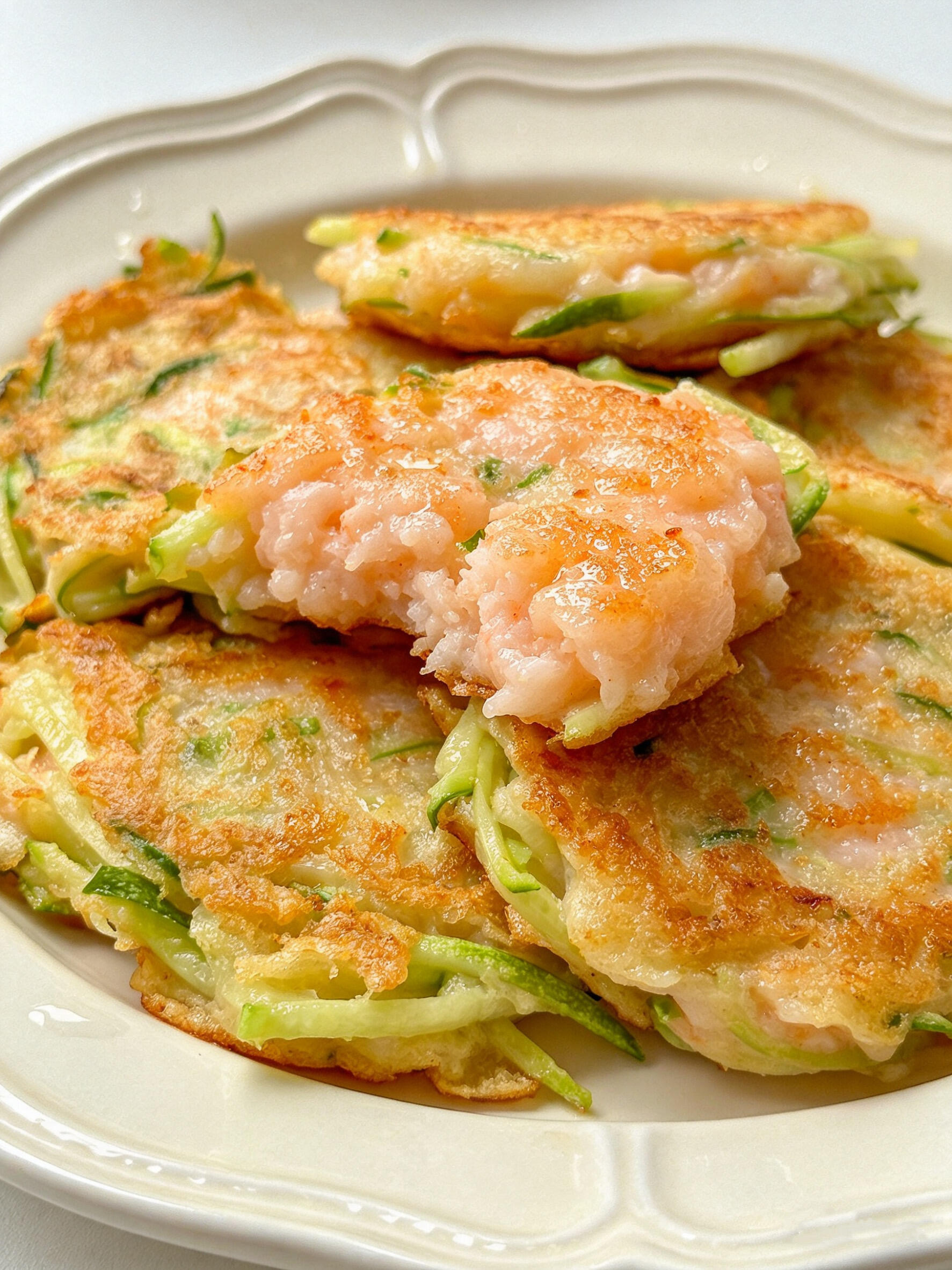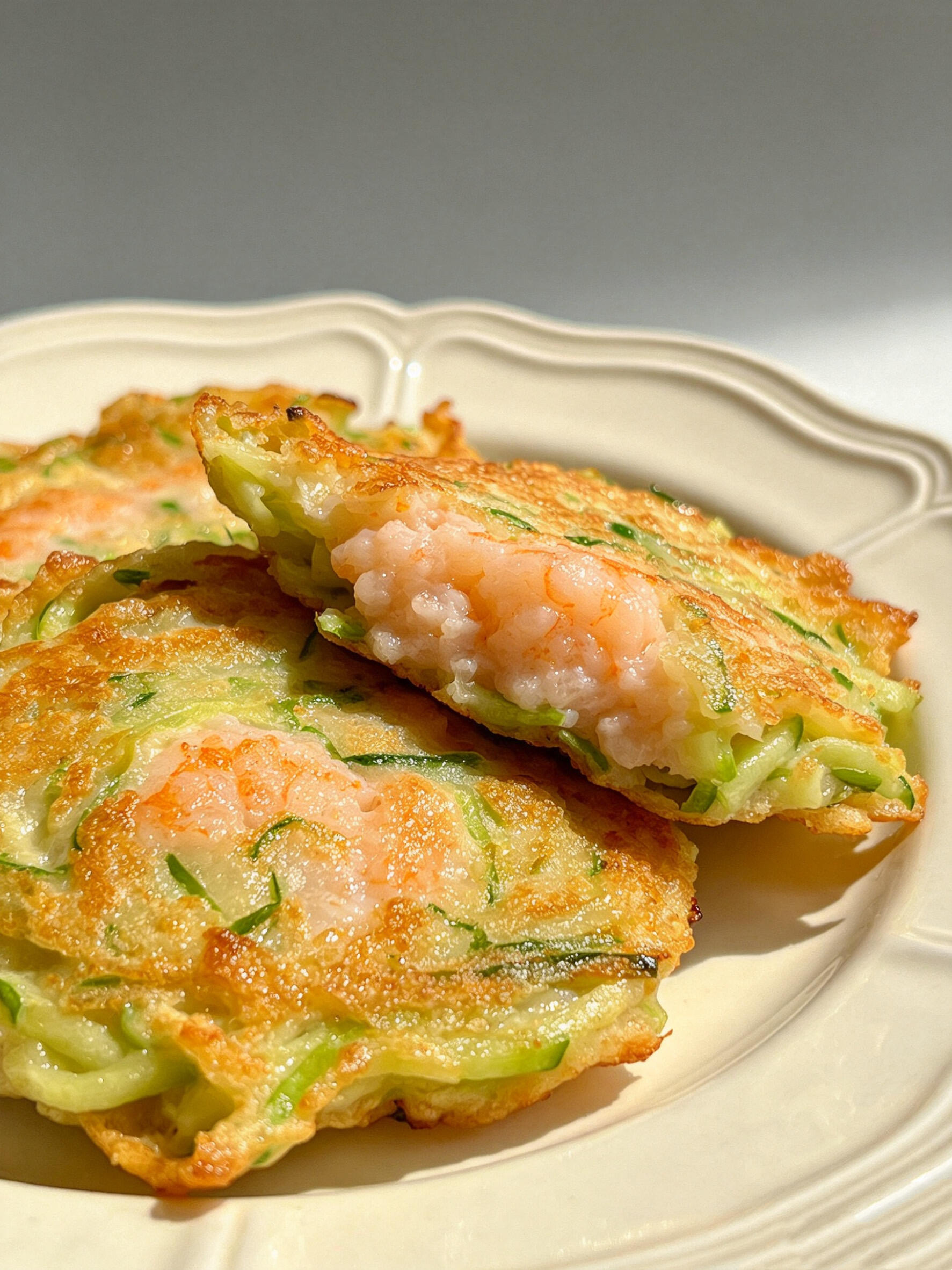刚出锅的虾仁饼,金黄的外皮带着微微的焦香,咬一口“咔嚓”作响;里面的西葫芦和胡萝卜丝脆嫩多汁,虾仁Q弹鲜甜,面粉和淀粉的比例刚刚好,饼皮不硬不软,吃完嘴里还留着蔬菜的清香和虾仁的鲜味。