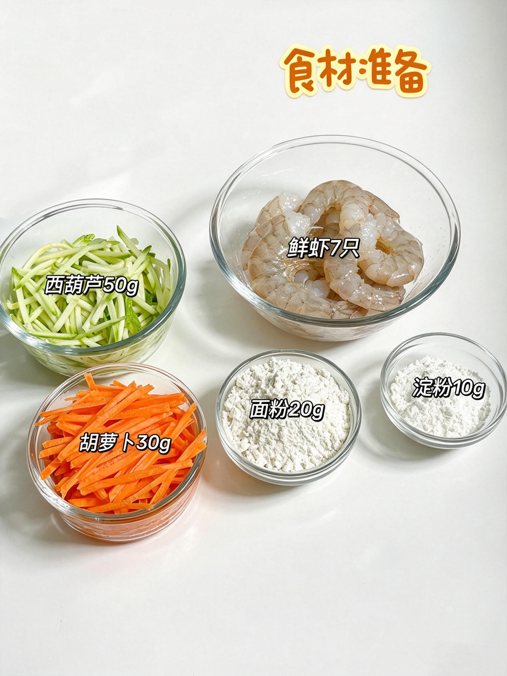 • 蔬菜CP:西葫芦(50g,擦成细丝,水分足更清爽)、胡萝卜(30g,擦丝后焯水,甜丝丝不塞牙)