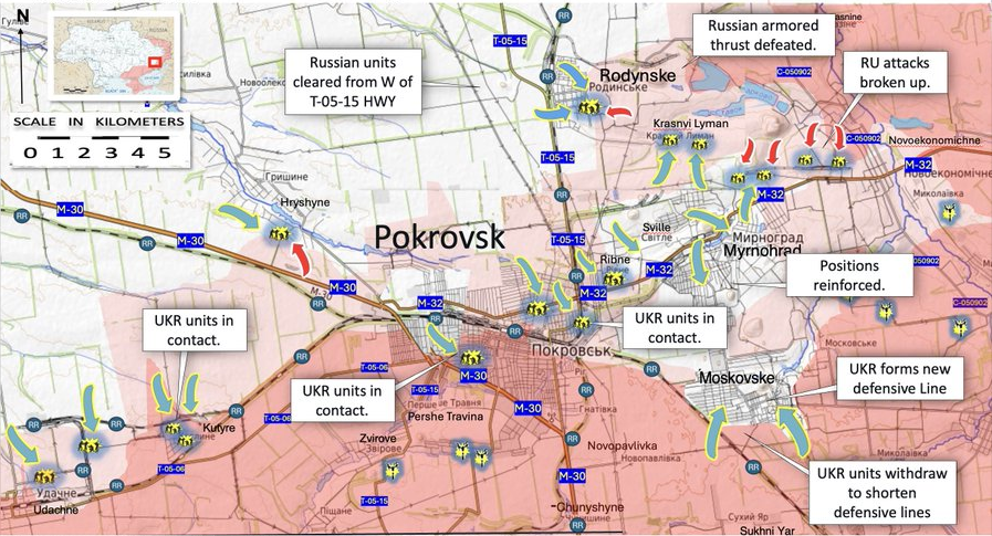 "在秋季的某个阶段,由于能力有限,波克罗夫斯克市已没有乌克兰军队。然而,从 11 月 15 日起,由于我们的进攻行动,我们得以控制波克罗夫斯克市内约 13 平方公里的领土(该市总面积为 29 平方公里)"。