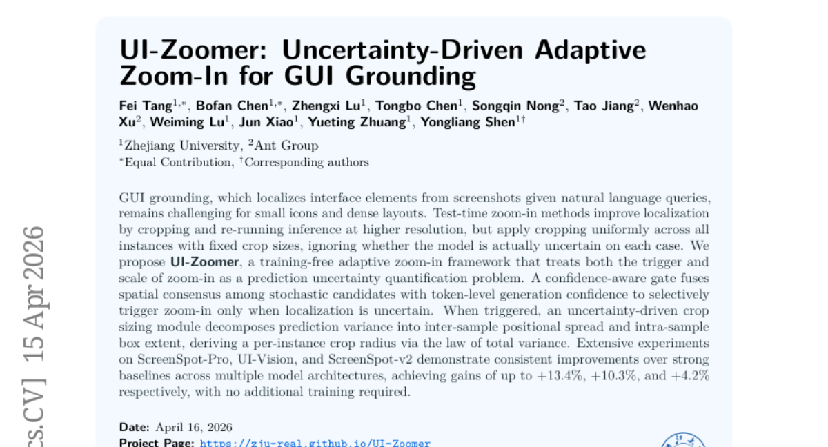 这项由浙江大学与蚂蚁集团联合开展的研究,发表于2026年4月,论文编号为arXiv:2604.14113,题为"UI-Zoomer: Uncertainty-Driven Adaptive Zoom-In for GUI Grounding"。感兴趣的读者可通过该编号在arXiv平台检索完整论文。
