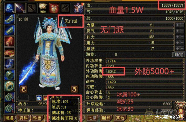 看得人眼晕啊!血量1.5万,外防5042,冰攻击109,减抗25,冰抗31!最最关键的是,这是个无门派号啊!