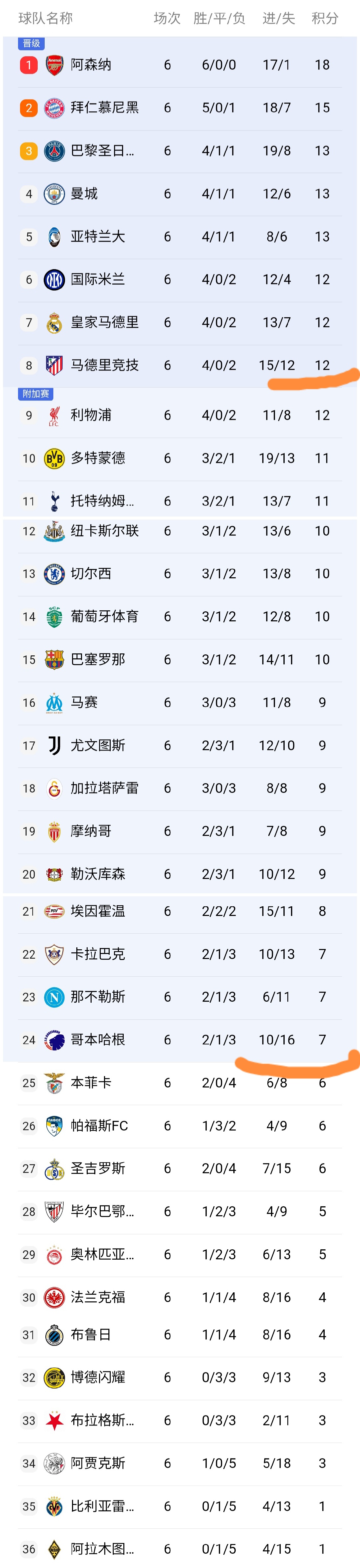 我们可以看到巴萨、切尔西、多特、利物浦、尤文这几支豪门球队在附加赛区,这显然不是他们应该所处的位置。