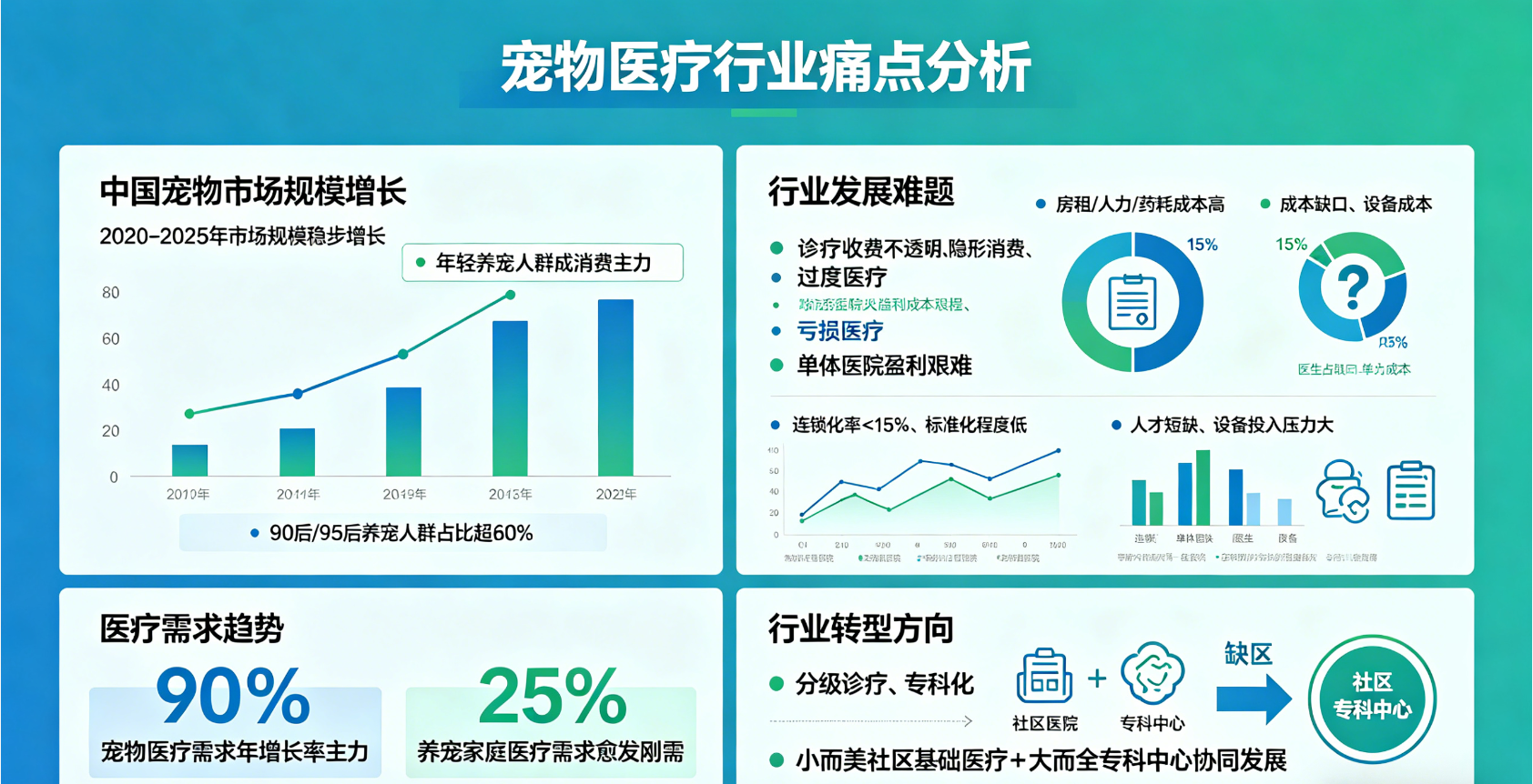 当前,我国宠物市场规模稳步增长,年轻养宠人群成为消费主力,养宠家庭对宠物医疗的需求愈发刚需,但行业发展仍面临多重难题。一方面,宠物诊疗收费不透明、隐形消费与过度医疗现象,严重消耗用户信任;另一方面,房租、人力、药耗成本高企,单体医院盈利艰难,行业连锁化率与标准化程度偏低,人才短缺与设备投入压力进一步加剧行业内卷。