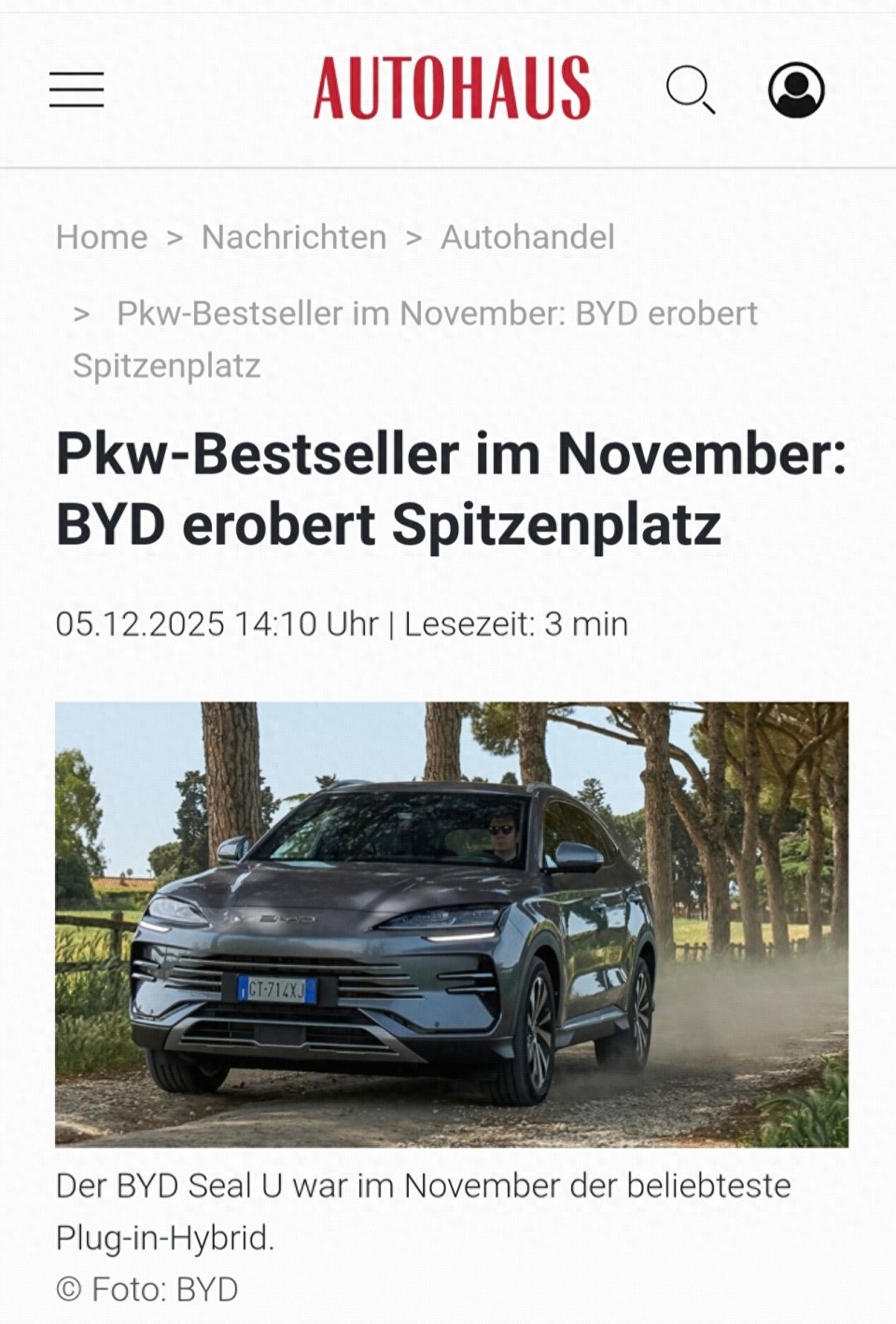 咱来唠唠比亚迪最近在海外的亮眼表现!BYD SEAL U(也就是咱国内的宋 PLUS)居然拿下了德国 11 月插混车型销量冠军,这可是中国汽车品牌头一回在德国主流细分市场登顶,太给咱长脸了,也说明比亚迪在欧洲算是彻底站稳脚跟,进入规模化突破的新阶段啦!