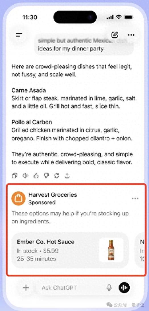 广告将出现在ChatGPT回答的底部,并明确标注为“赞助内容(sponsored)”。