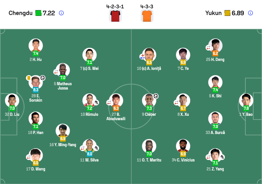 北京时间4月21日晚19点35,2026赛季中超联赛第7轮,成都蓉城主场2-1逆转云南玉昆。上半场克莱伯破门助云南玉昆领先,下半场索罗金破门扳平比分,费利佩进球反超比分。此外,拜合拉木、奥斯卡各自打进2球,可惜都被吹掉了。