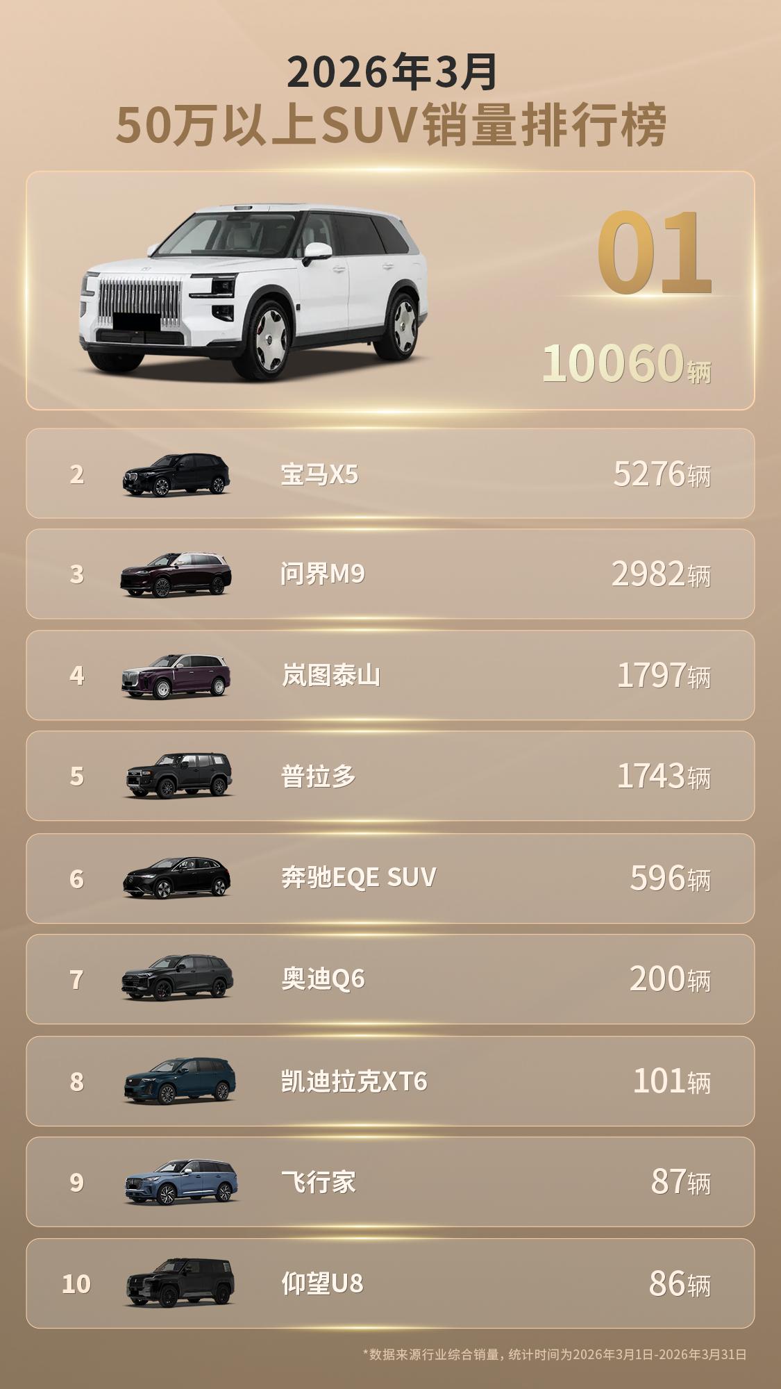 从去年11月开始第一次成为50万以上大型SUV销冠,到今年3月销量再次破万,成为榜单TOP1,极氪9X已豪取“五连冠”。