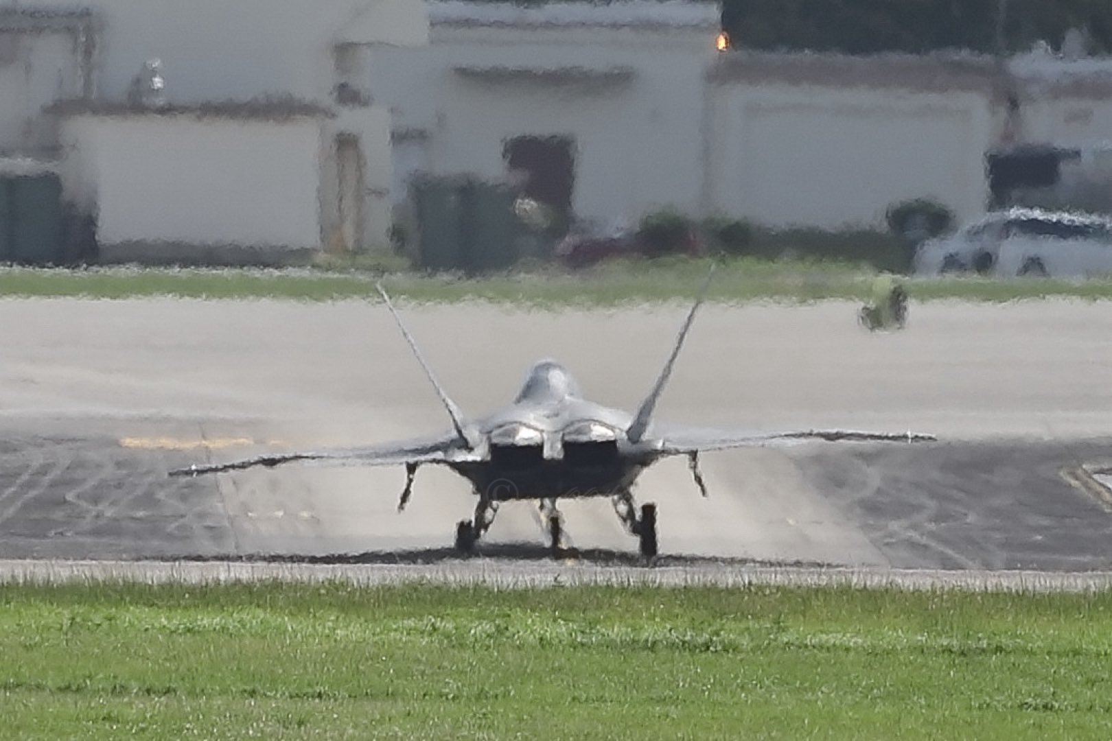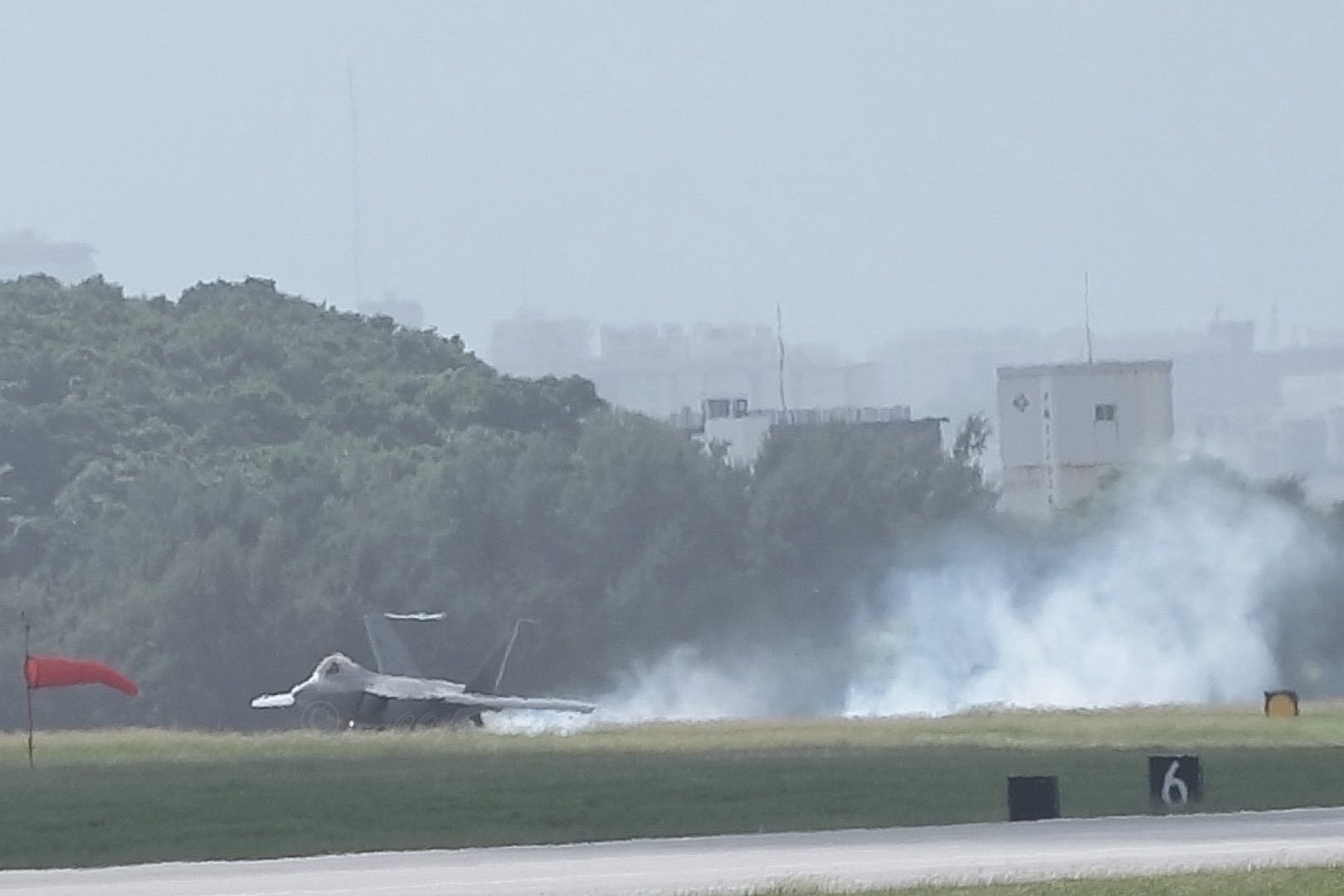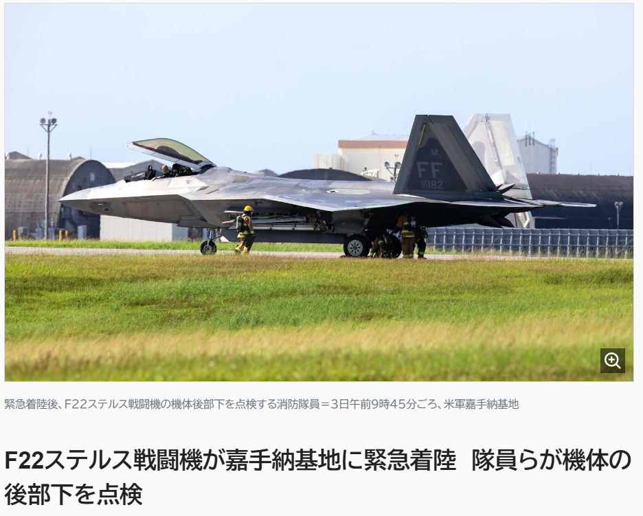 接着,10月3日,仅隔两周,F-22再次紧急迫降冲绳嘉手纳,这次捂得更严实,没有任何来自美军的官方说明,但冲绳当地媒体拍到了消防员检查飞机后机身的照片。