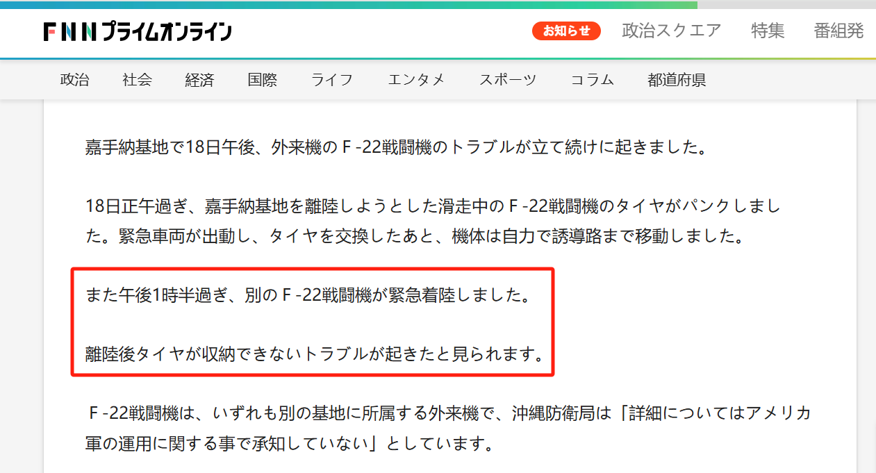 继续,10月18日,同一天,紧接着上面那架爆胎的F-22之后,不到两个小时,又双叒叕一架F-22出事——升空后主起落架无法收起,被迫紧急降落返修。