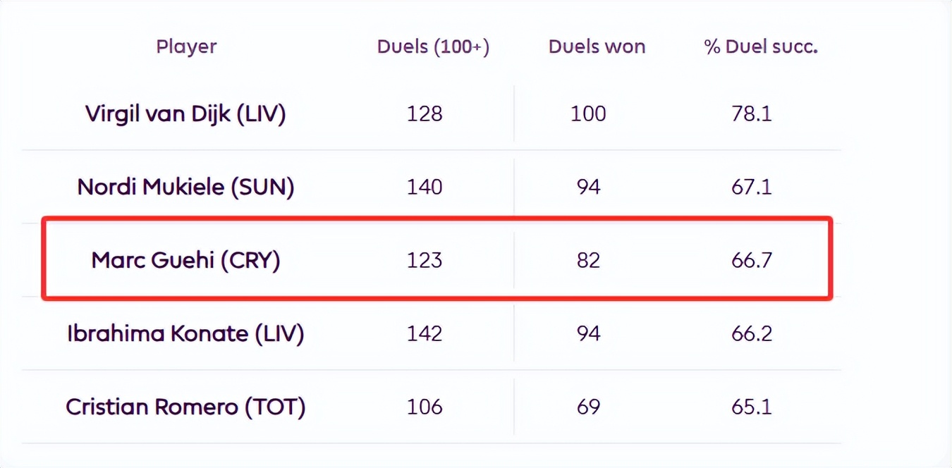 格伊的对抗成功率位列英超中卫第三(66.7%)