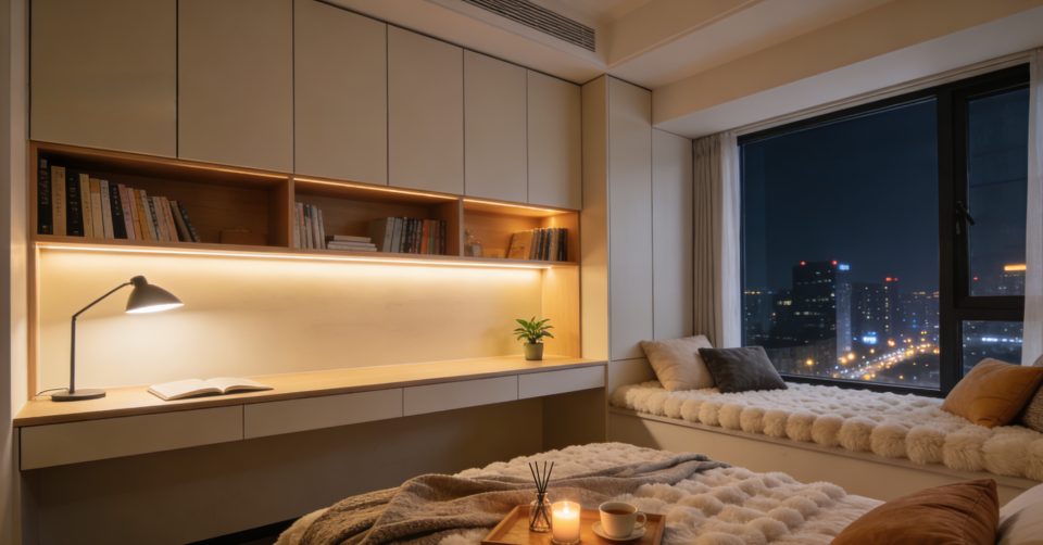 收纳做减法,采用嵌入式柜体与开放架结合,避免视觉压抑,杂乱物品用统一容器收纳。