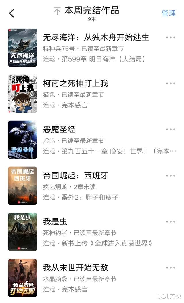 除了女魔头心魔那本,特种兵76号的《无尽海洋:从独木舟开始逃生》、猫色的《柯南之死神盯上我》等作品也都完结了。