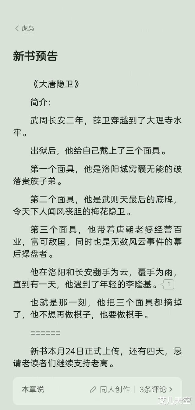 历史大神高月会在明天正式上传新书《大唐隐卫》,这个是几天前他在《虎枭》里预告过的,估计老书快完结了。