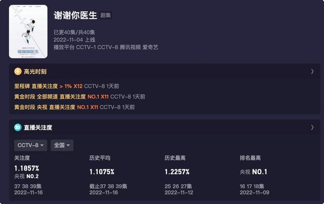 但要说真正打开下沉市场的好剧,还得是央视上星的《谢谢你医生》,根据《谢谢你医生》开播以来的收视率来看,这部剧的成绩已经稳定在破1的水准,黄金时段收视排名历史最高第一,从未掉出前三。