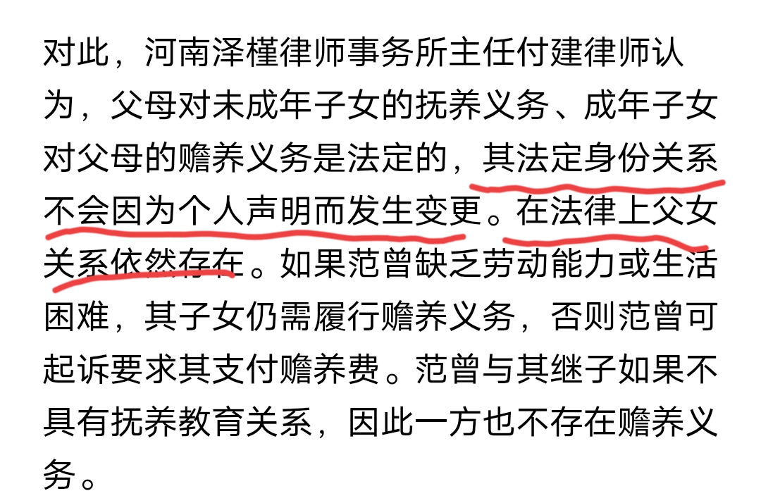 此外,今天知名律师付建也称,就算范曾宣布断绝父女关系,但是并没有什么法律效力,因为法定身份关系不会因为一纸声明而发生变更,在法律上父女关系依然存在。