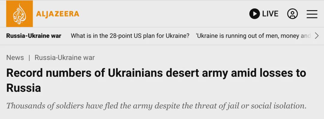 当地时间12月9日,半岛电视台发布了一篇题为《乌克兰前线伤亡惨重,逃兵数量创下历史新高》的文章,其副标题为《尽管面临监禁威胁或可能遭社会孤立,仍有成千上万的士兵逃离部队》。