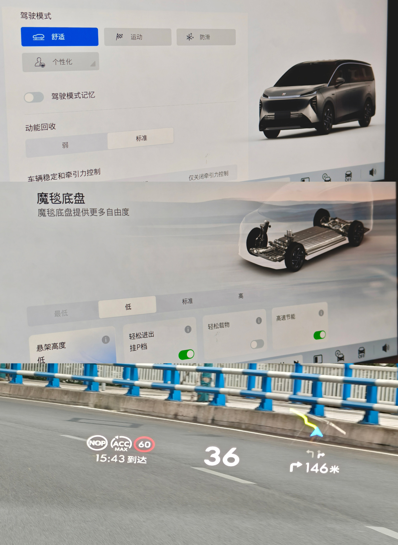 当然,我最喜欢的还是在进入自定义模式后,能把悬架阻尼单独设置为“标准”——这反而是至境世家纯电版的“最佳状态”。避震阻尼既不会过软,也不会过硬影响到后排乘客的舒适性,属于兼顾了驾驶者操控需求与后排乘坐感受。反观许多MPV车型上的舒适模式,过于强调对路面的隔绝感,把避震阻尼放得太软,反而会导致车身姿态不够干脆,从而导致乘客出现晕车的情况。
