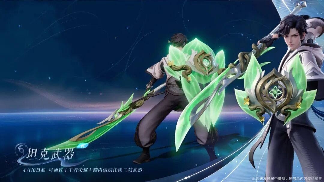 坦克武器名为“云梦止戈”,是刀与盾的组合,盾还可以变化大小。特效同样也是绿色为主。