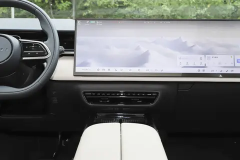 内饰的科技感也很足,中控台是 26.45 英寸的 5K 一体屏,分辨率特别高,不管是看导航还是播放视频,都没颗粒感,操作起来也很流畅,没有卡顿的情况。销售说用的是 4nm 车规级芯片,运算能力比普通车规芯片强不少,就算同时开导航、放音乐、连蓝牙,也不会出现反应慢的情况。最让我惊喜的是 100 英寸裸眼 3D HUD,开车的时候不用低头看中控屏,抬头就能看到车速、导航路线,3D 效果很自然,不会觉得眩晕,尤其是导航的时候,车道指引和转弯角度提示特别精准,比一直盯着中控屏安全多了。