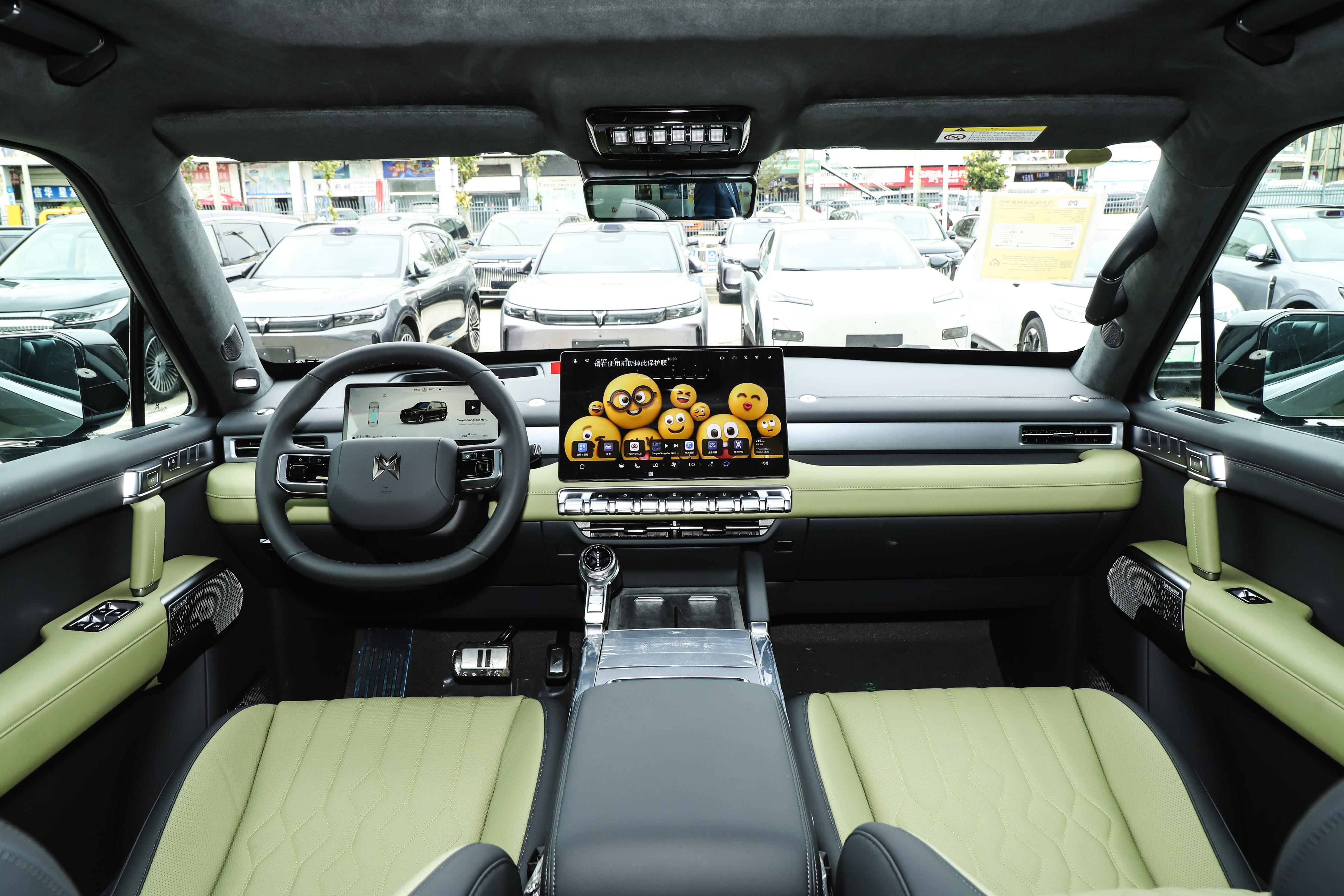 拉开车门,“未来先锋机甲”内饰风格与外形呼应,横平竖直的线条、大量金属质感材质与豪华软包的碰撞,营造出“金属风暴”意境。中控台对称布局,视觉上向两侧延伸。金属质感飞航旋钮设计灵感源于战斗机仪表,、用于切换多种驾驶模式,仪式感很强。车内门把手造型如手枪握柄,关门声也经过特别调校,进一步强化了硬核氛围。全车高达32平方米的软质包覆,其中接触面大量使用Nappa真皮,触感细腻,顶棚则采用绒质面料,A柱提供越野拉手,副驾前面配有开放式储物槽,整个内饰将硬派越野的豪放与座舱的豪华舒适结合的很到位。