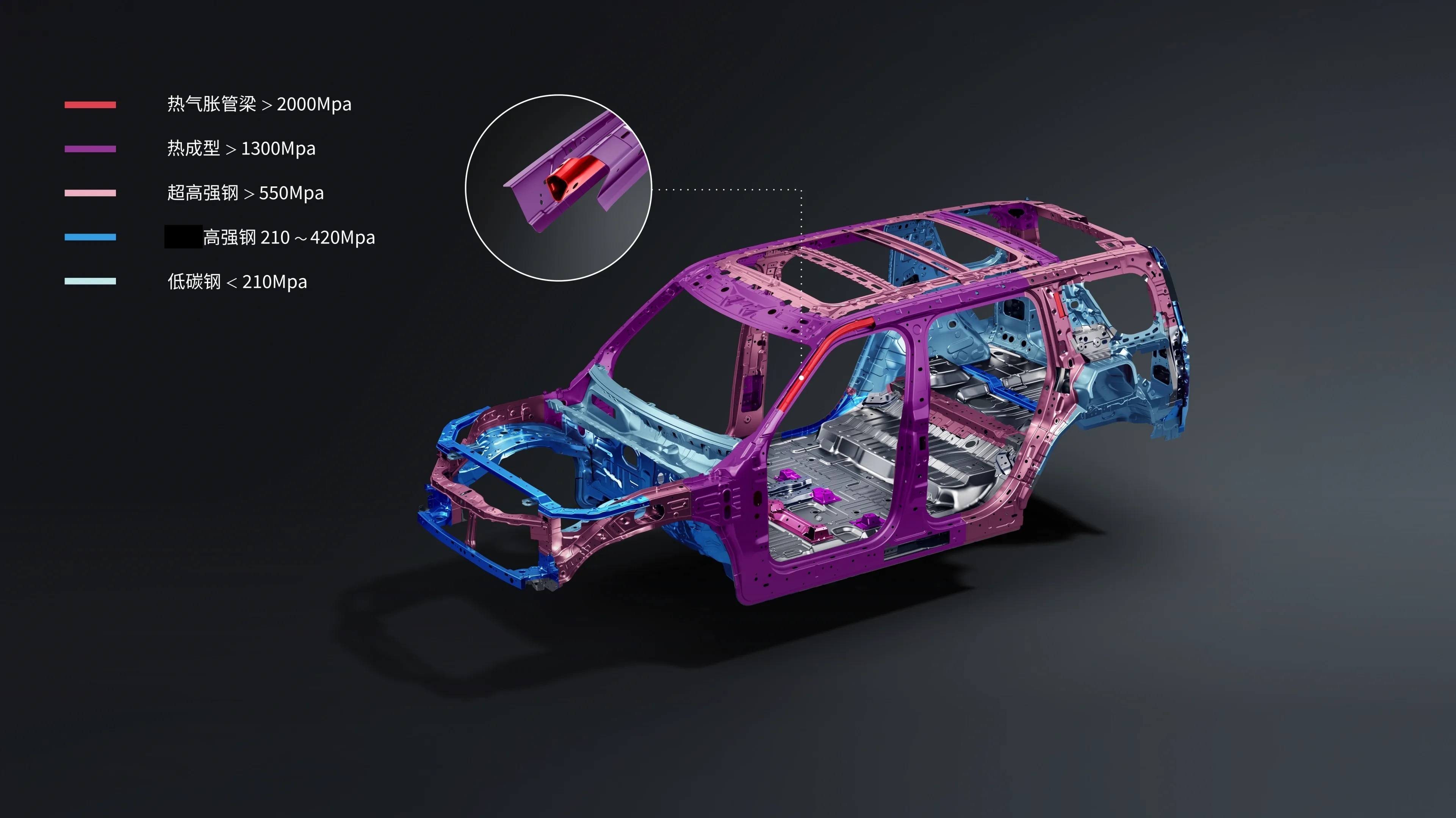 白车身采用超高强度笼式安全车身结构,高强度钢用料占比达83.2%,关键部位使用2000MPa热成型钢。针对越野可能发生的翻滚风险,针对车顶做了强化设计,前后横梁、A/B柱等关键位置顶压均超126kN(12.9吨),标配8个安全气囊,安全气帘保压时间长达30秒,远超行业标准。电池安全则经过超国标严苛测试,拥有10层装甲防护,并通过了远超国标时长和强度的振动、冲击与涉水考验,为野外驰骋提供了坚实保障。