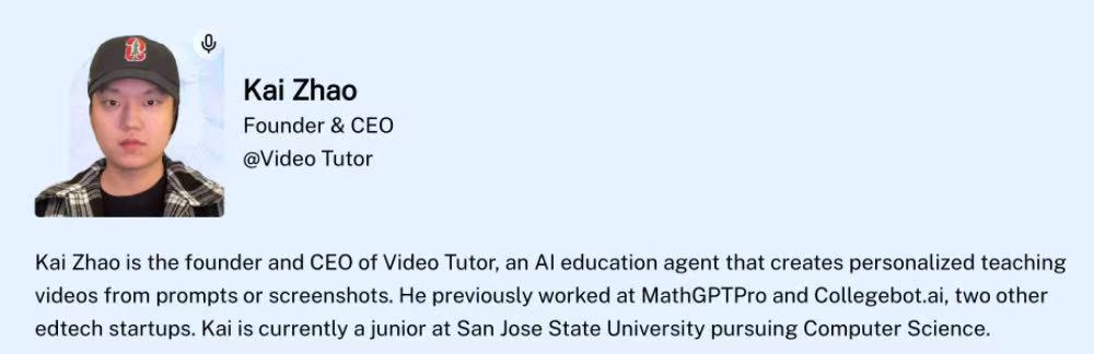 VideoTutor由华人大三学生赵凯(Kai Zhao)创立,目前团队共6人。CTO James Zhan曾在Google Gemini项目组担任核心AI工程师,与赵凯同校并从大一开始合作创业。