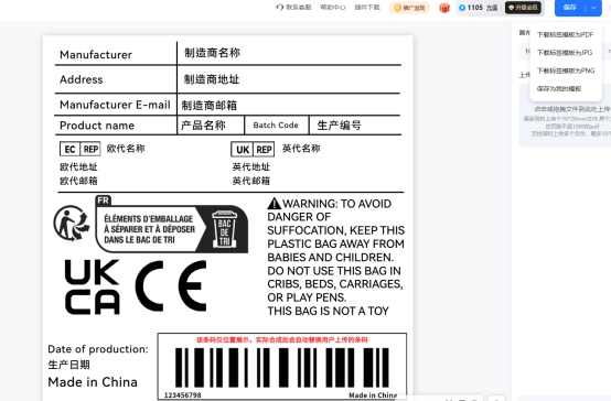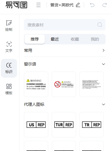 2、内置各类商品标识警示语:作为跨境电商从业者,都深知跨境行业的合规化程度有多严苛!为了保证商品能顺利通过海关查验与审核,易可图整合了海量满足多国/多平台要求的商品标识警示语,如易碎品警示语、向上放置警示语、防火标志、包装安全警示语等,只需鼠标轻轻一点即可将其添加至标签中。