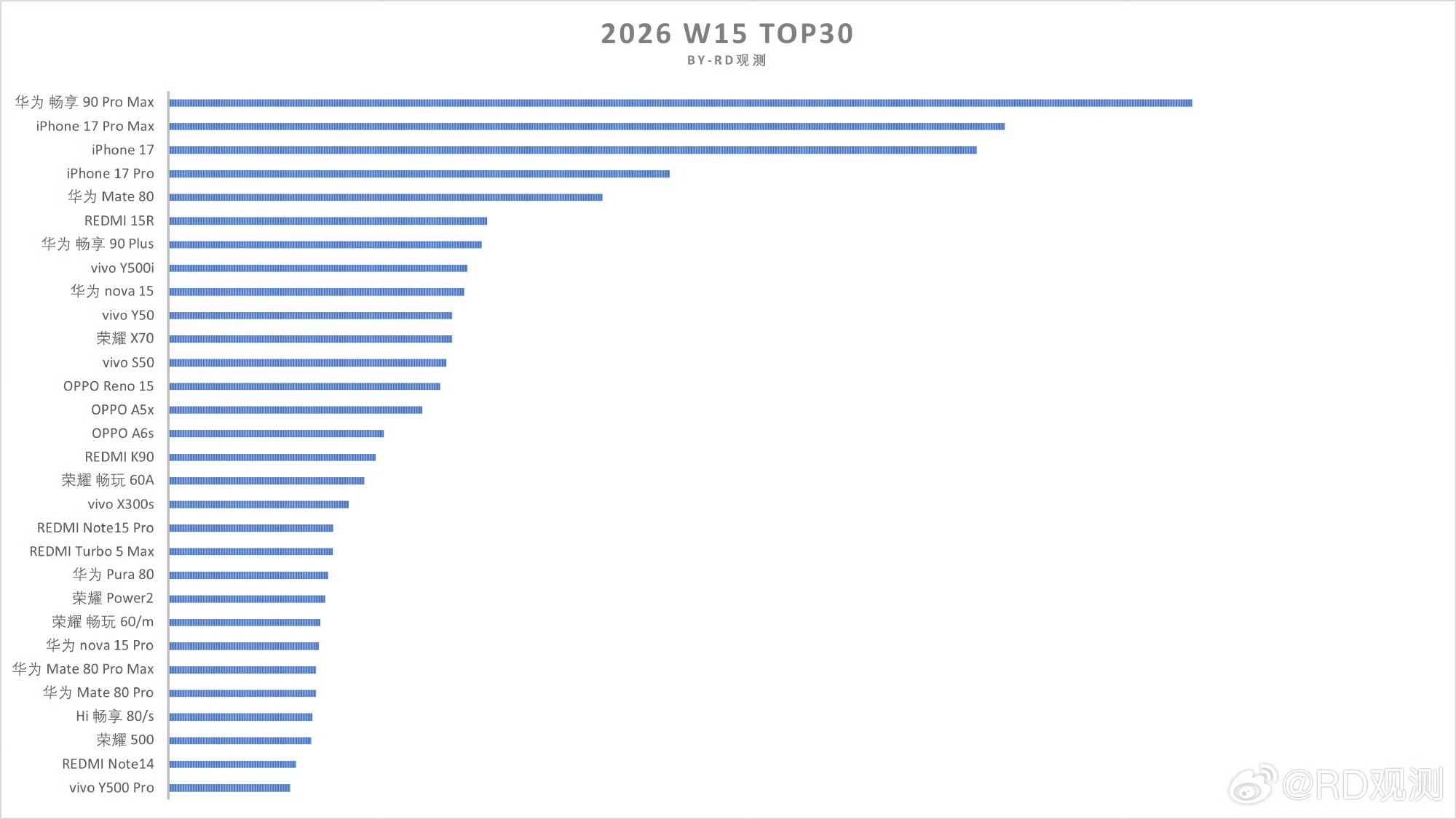 畅享系列是华为主打中低端市场的产品,配置虽然一般,但价格相比Mate系列,Pura系列,Nova系列确实会更加亲民,畅享90系列拥有三款机型可选,起步价为1299元,其中最受欢迎的是1699元起的畅享90ProMax,首周激活销量超过 40 万,同时还超越 iPhone 17 全系列,拿下 W14 单周单品销量第一,2026年W15的数据出炉,华为畅享90ProMax再次击败iPhone17系列,拿下周销量冠军,华为的市场份额依然高达24.54%,断层式的领先第二名的苹果。
