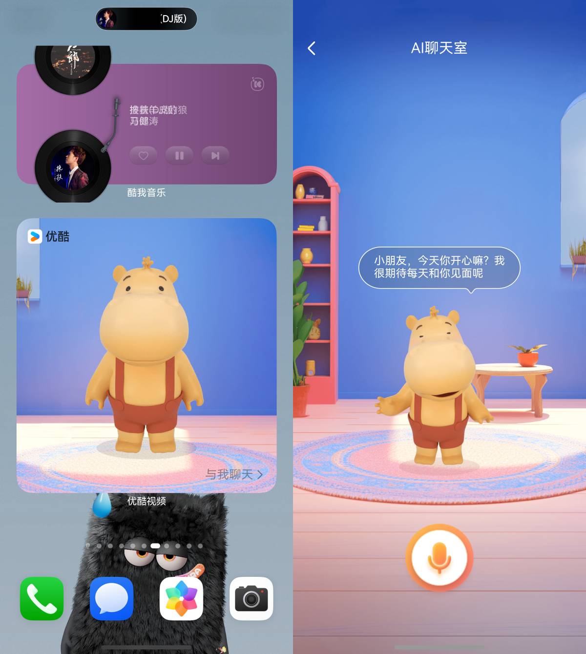 不止出行和体育赛事类应用,影音类应用的互动卡片同样亮点十足。在鸿蒙版优酷视频的AI陪伴卡片上,3D河马形象能借助“无界动效引擎”实现流畅的出框放大与动作反馈,点击“与我聊天”还能进入AI聊天室与河马语音互动。鸿蒙版酷我音乐的播放卡片,则精准复刻了实体唱机的机械美学,切歌时的唱片切换动效,为听歌增添了满满的仪式感。这些互动卡片共同指向一个趋势:HarmonyOS 6正在推动桌面交互从“信息呈现”向“情感化陪伴”演进。