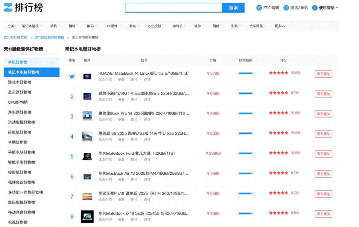 临近年末,笔记本电脑市场迎来销售高峰。如果你准备出手,到底该怎么选择呢?可以关注权威媒体的榜单和用户的口碑。比如,在ZOL(中关村在线)在近期发布的“双11超级测评好物榜”中,华为MateBook 14就霸榜“笔记本电脑好物榜”。这已经不是华为笔记本第一次登上各类榜单。事实上,华为MateBook 14、华为MateBook D 16、华为MateBook D 14等多款机型均持续热销,成为各大电商平台销售榜单的常客,并且收获了大量用户好评。