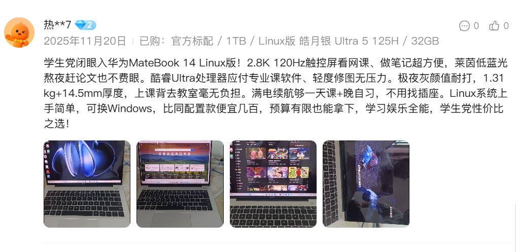 有大学生用户就评价说,“酷睿Ultra处理器应付专业课软件、轻度修图无压力。极夜灰颜值耐打,1.31kg+14.5mm厚度,上课背去教室毫无负担。满电续航够一天课+晚自习,不用找插座。”