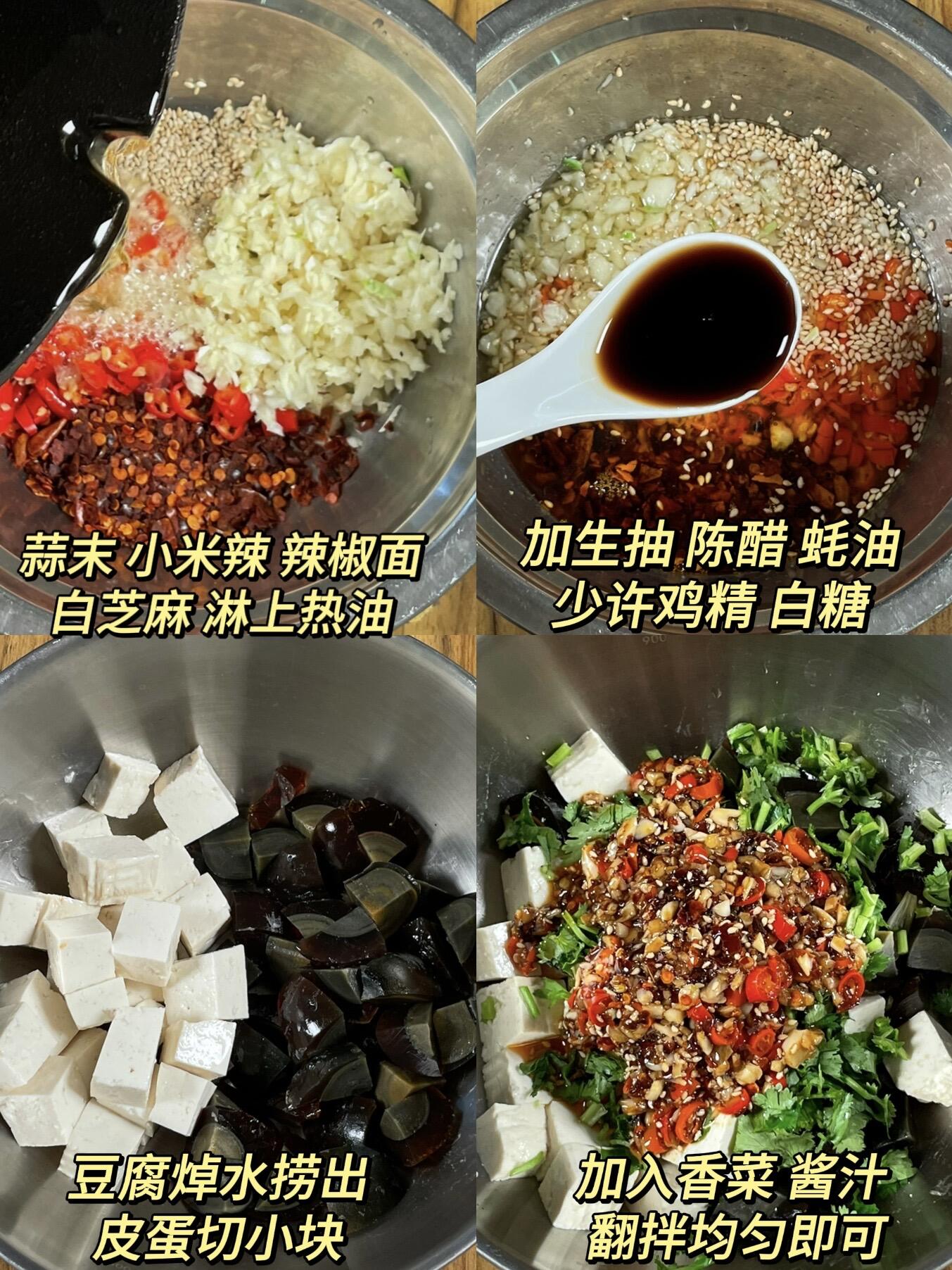 • ✅ 记住“豆腐焯水+酱汁2酱3汁1糖+皮蛋切小块”,保证你做的凉拌菜酸辣鲜香,清爽解腻!