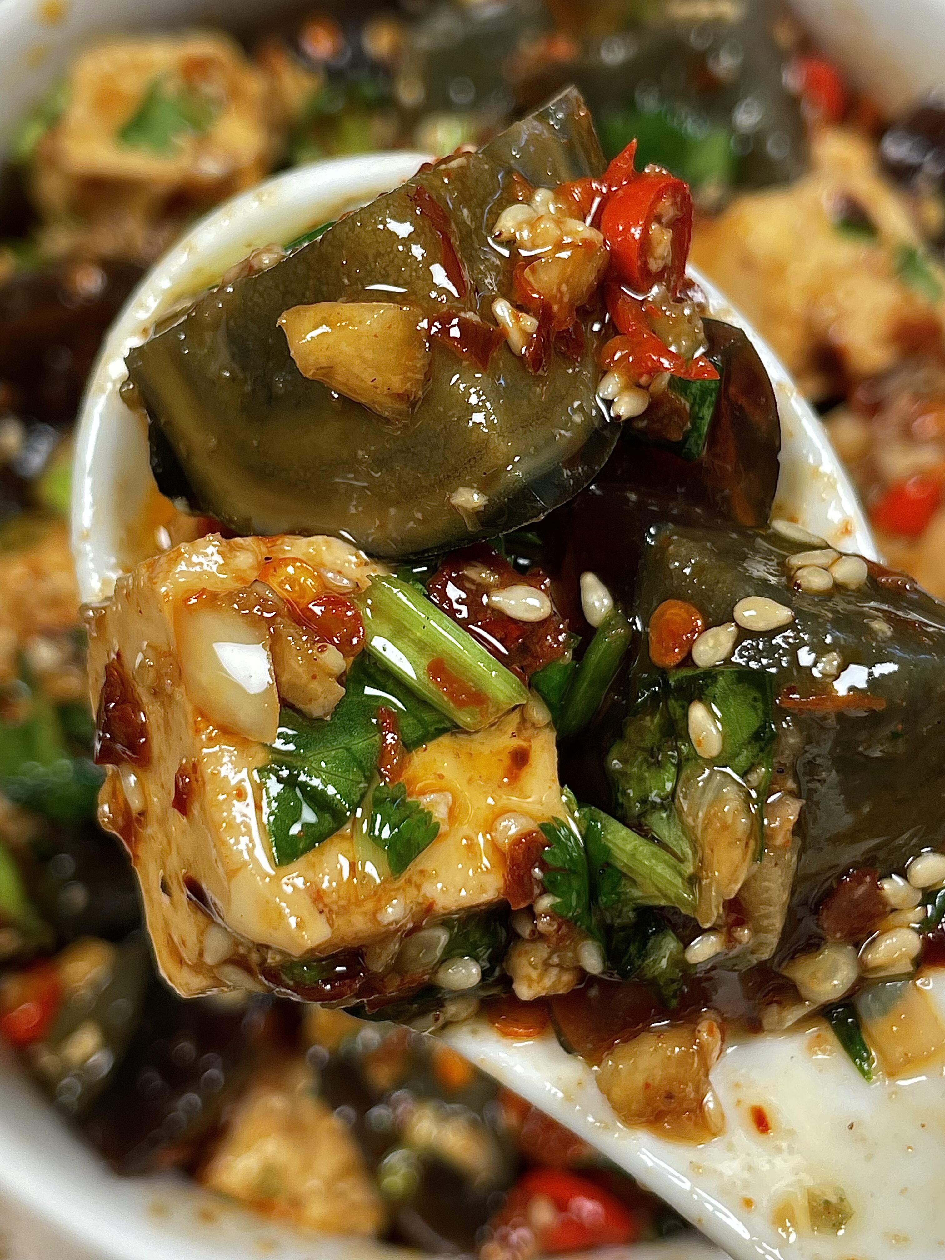 刚拌好的凉拌皮蛋豆腐,豆腐滑嫩多汁,皮蛋Q弹入味,酸辣浓郁的酱汁裹在每一块食材上,香菜的清香和蒜末的香味完美融合,一口接一口根本停不下来!配米饭、配面条,或者当下酒菜,都超合适。