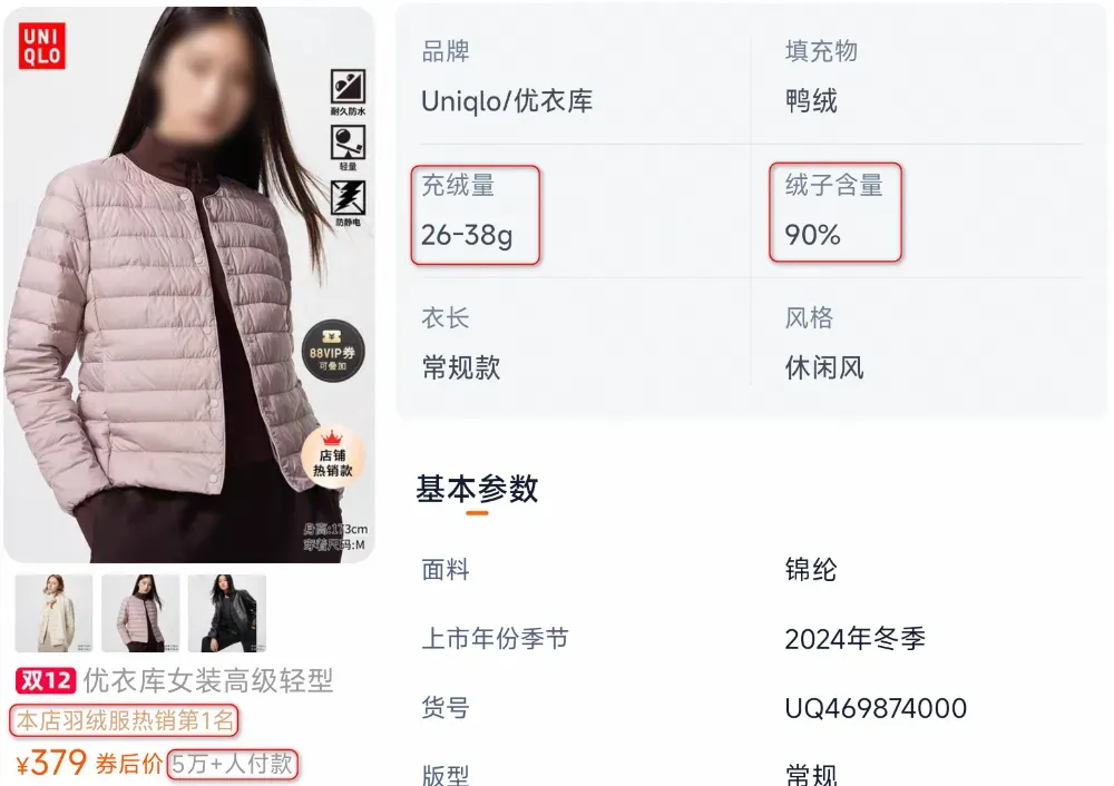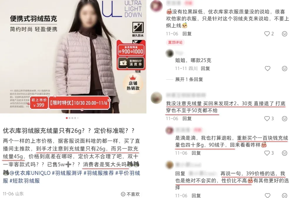 实际上:399元的价格+仅有26克的充绒量=优衣库“网评黑榜”top1。