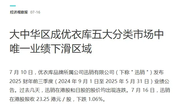 据迅销财报,中国大陆市场业绩在2025财年连续下滑。在中期报(2024年9月1日至2025年2月28日)中,中国大陆市场收益较上年度同期减少约 4%,经营溢利同比下降约11%。