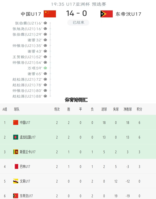 赛后,中国14-0东帝汶,取得两连胜且保持零封,本场中国还有3个进球因越位、先出底线而无效。本组其余比赛,孟加拉8-0文莱、巴林2-1斯里兰卡。