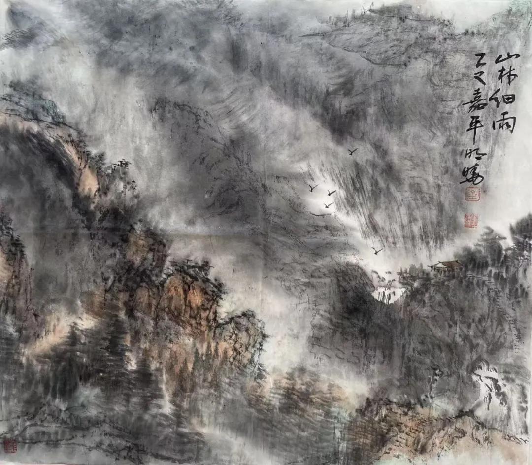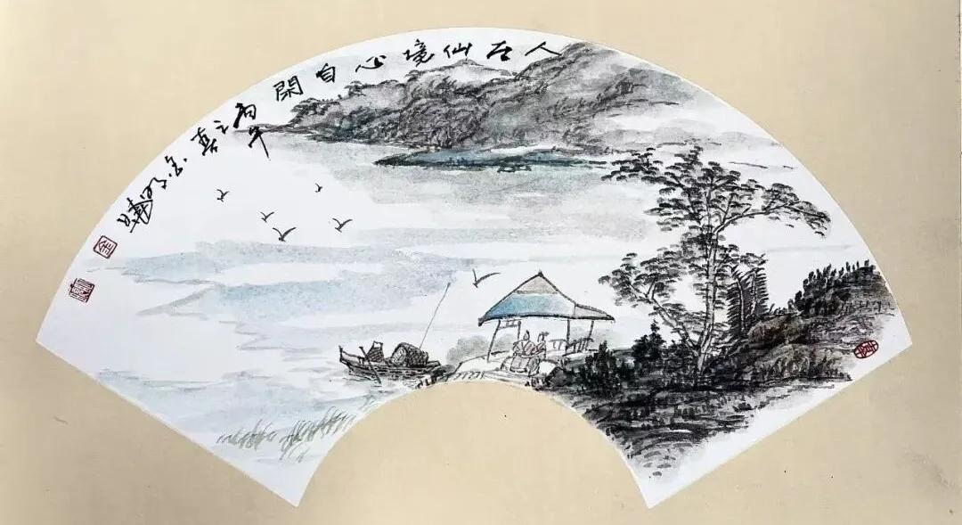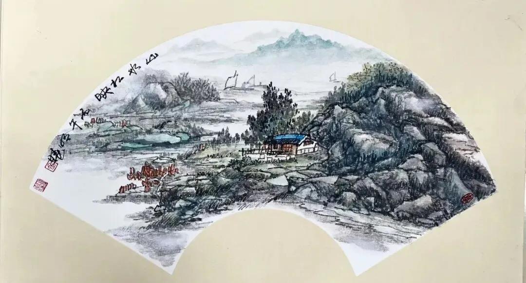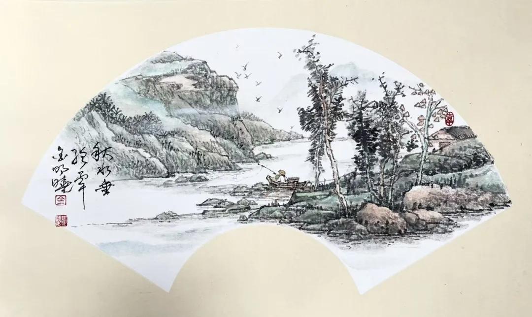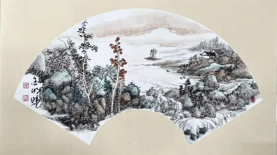 金明晓的艺术风格注重写生基础与意境营造,山水画构图宏阔、笔触磅礴细腻,既有宋元山水的骨法,又融入对时代气息的敏锐捕捉,被评价为“在尺幅之间营造出深远意境,每一幅皆如一首无声的诗”。其花鸟画则以写意手法展现勃勃生机,尤以团扇作品精妙著称,笔法灵动、色彩清丽,彰显“以小见大”的创作理念。