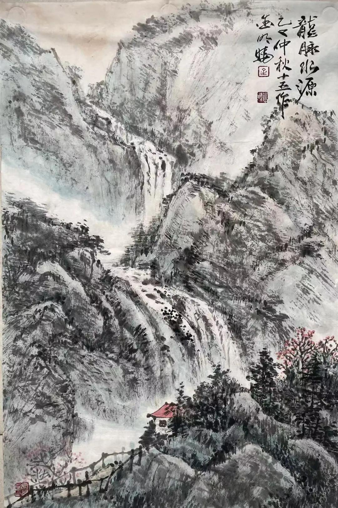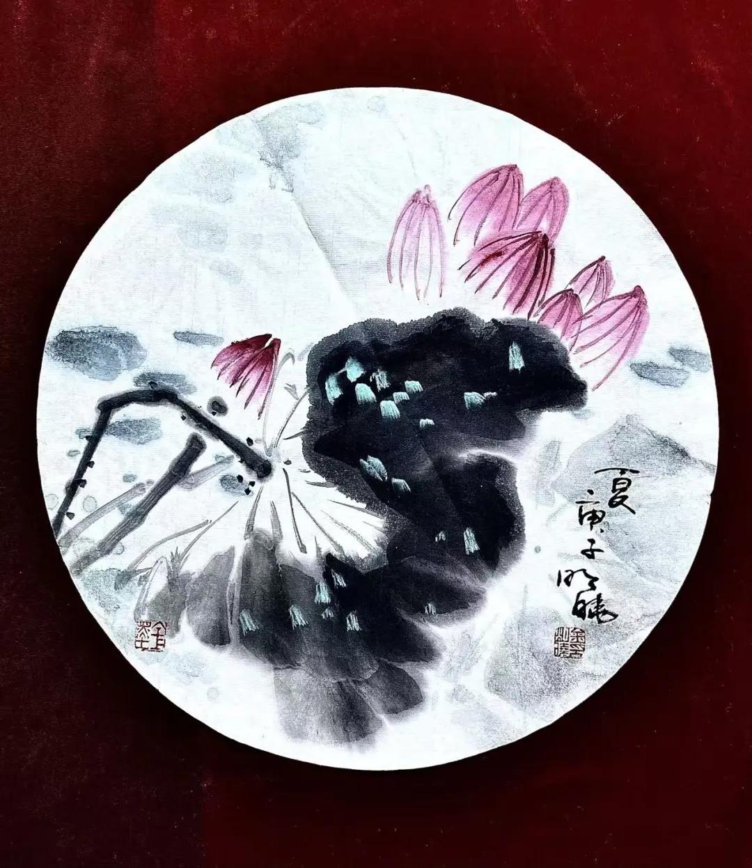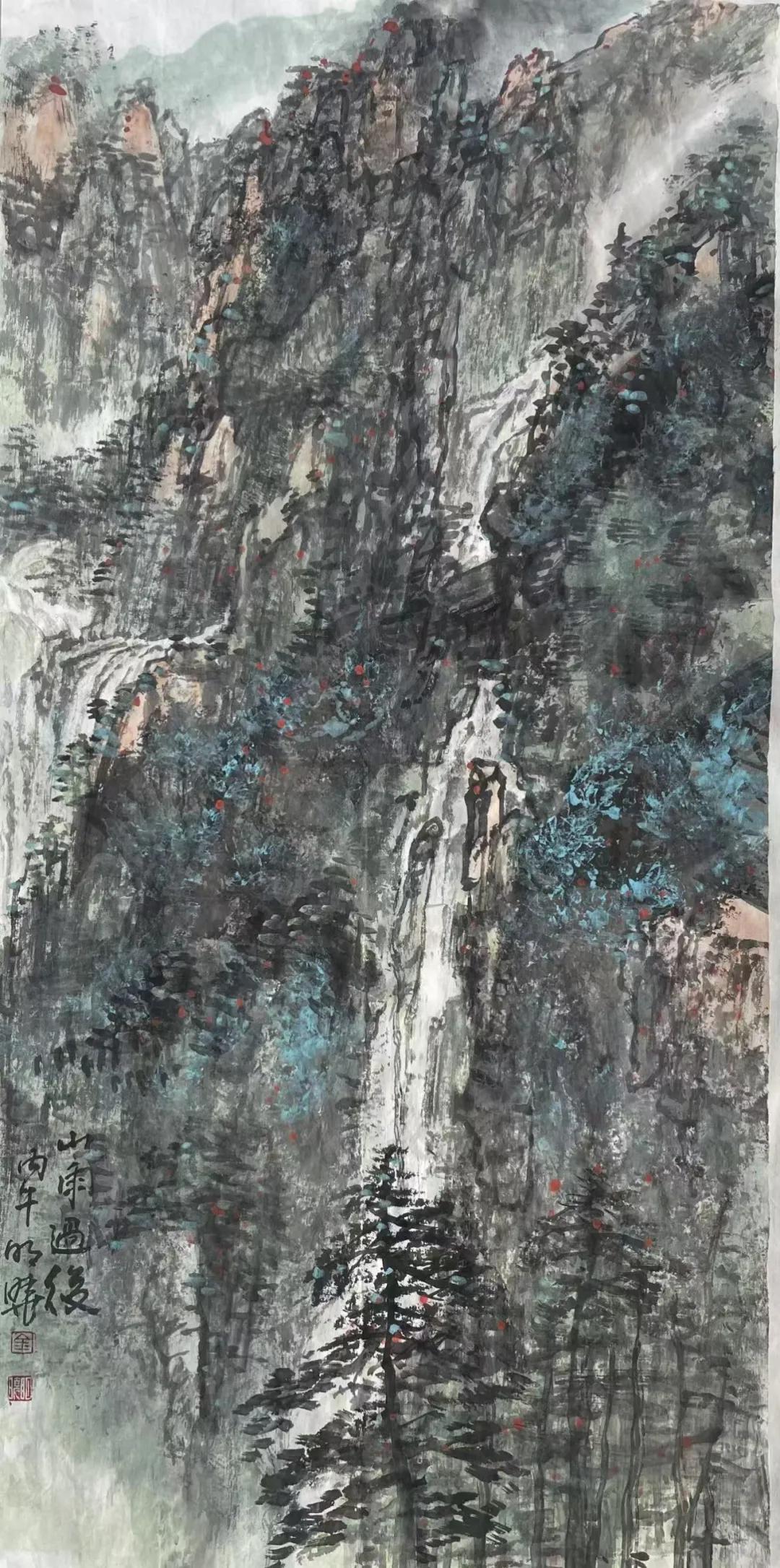 金明晓的艺术风格注重写生基础与意境营造,山水画构图宏阔、笔触磅礴细腻,既有宋元山水的骨法,又融入对时代气息的敏锐捕捉,被评价为“在尺幅之间营造出深远意境,每一幅皆如一首无声的诗”。其花鸟画则以写意手法展现勃勃生机,尤以团扇作品精妙著称,笔法灵动、色彩清丽,彰显“以小见大”的创作理念。