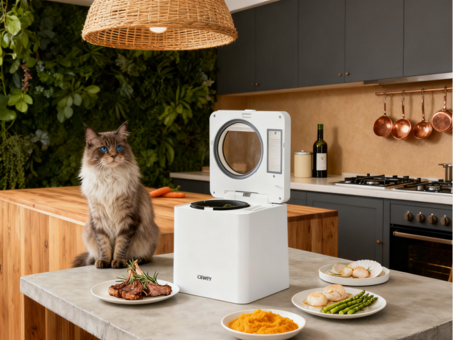 三、写在最后很多人以为宠物料理机只是更贵的辅食机,但真正用过才知道区别不在功能数量,而在体验细节。破壁机、辅食机都能打肉,却做不好控温和熟化这一环。做鲜食最怕流程拖太久。普通机器需要分开处理,清洗也麻烦。CEWEY 这类宠物料理机把几个关键步骤合在一起。节奏变得顺,日常也更容易坚持。